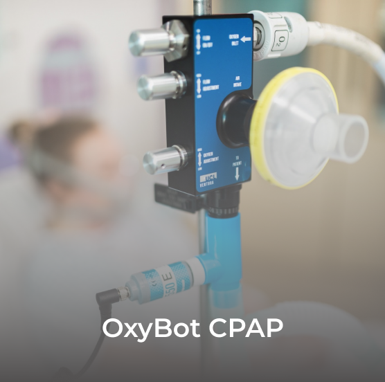 OxyBot CPAP device supports patients with breathing difficulties. It works by pushing an air-oxygen mix into the mouth and nose at a continuous pressure, keeping airways open and increasing the amount of oxygen entering the blood stream. This breathing aid can be used to help Covid-19 patients with serious respiratory problems to breathe more easily and has been shown to help prevent the need for invasive ventilation. The design is based on an existing off-patent CPAP system that has been further modified to optimise oxygen consumption.